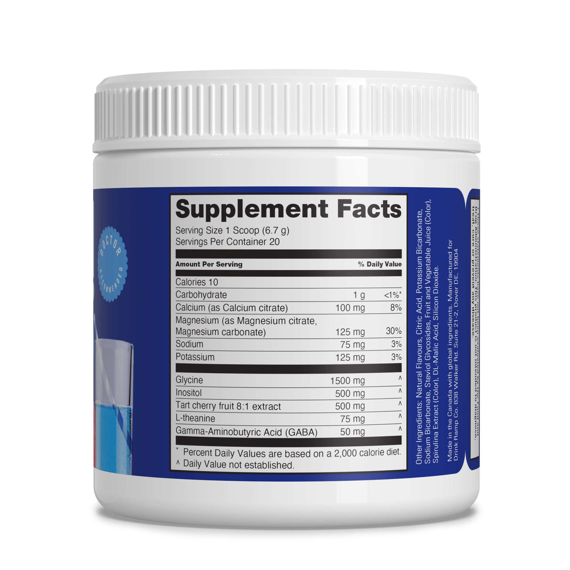 Glycine, Inositol, Tart Cherry Fruit, Magnesium Bisglycinate, Magnesium Carbonate, Calcium Citrate, L-Theanine, and GABA (Gamma-Aminobutyric Acid).
