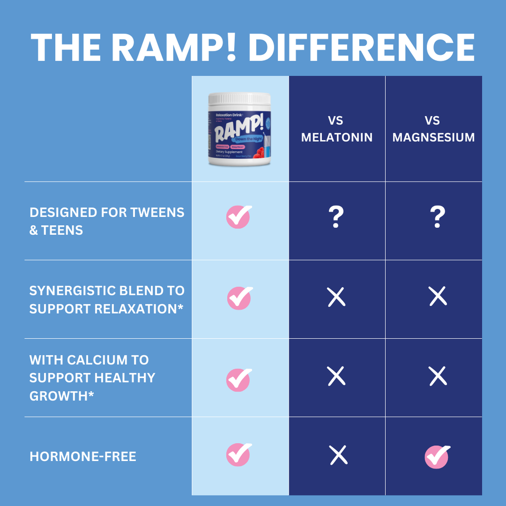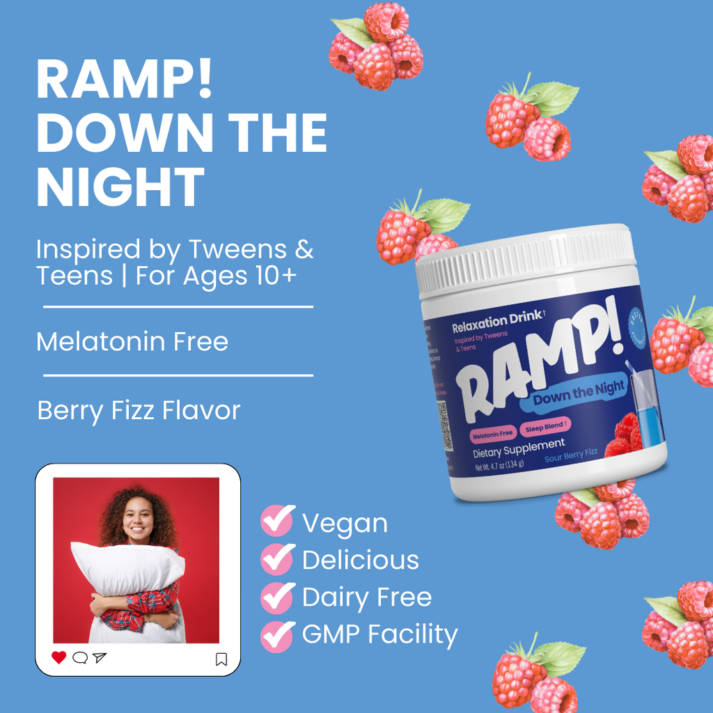 Stress and sleep issues are common in tweens and teens. Parents struggle to find natural and effective first-line options to address these challenges. Inspired by teens' needs, Ramp! Down at Night provides a functional and curated nutrition solution for modern life.