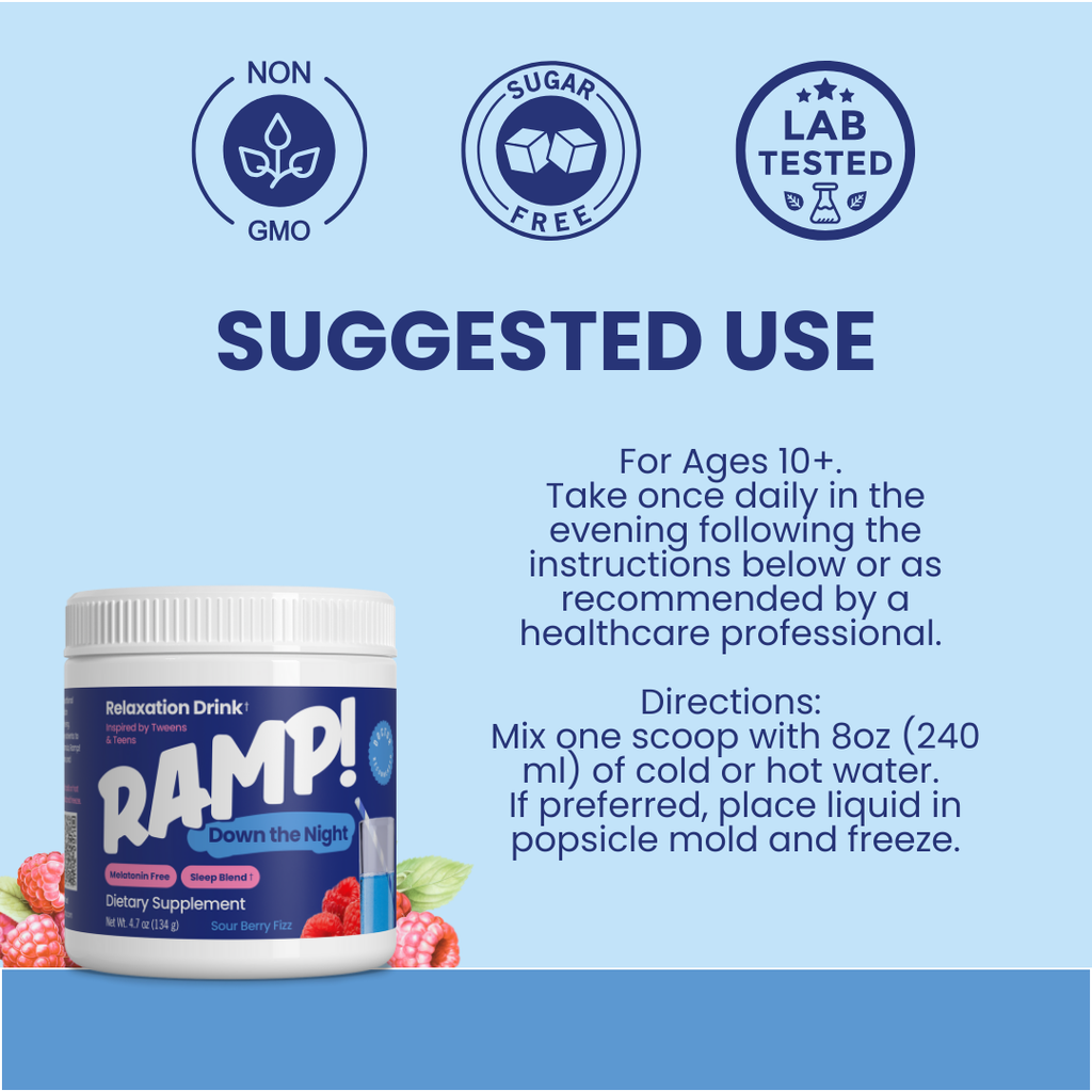 Ramp! Down at Night easily becomes a part of a daily routine. The convenient format and delicious, Sour Blue Raspberry Fizz flavor make this supportive powder both teen and parent-approved.